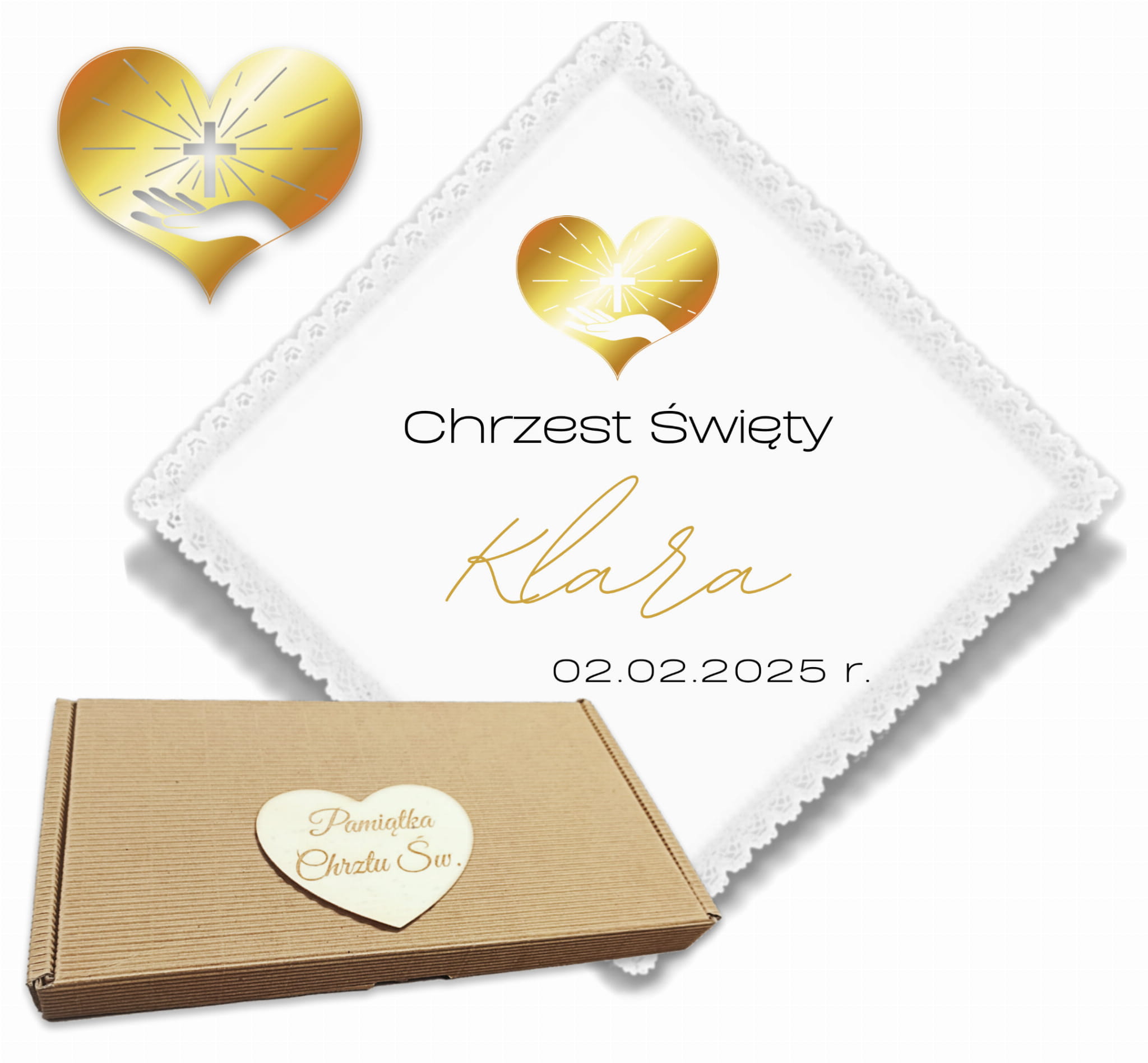 Szatka: Uszyta z delikatnych materiałów, ozdobiona subtelnym projektem, który można spersonalizować imieniem dziecka i datą chrztu. Idealna na symboliczne nałożenie w trakcie sakramentu.