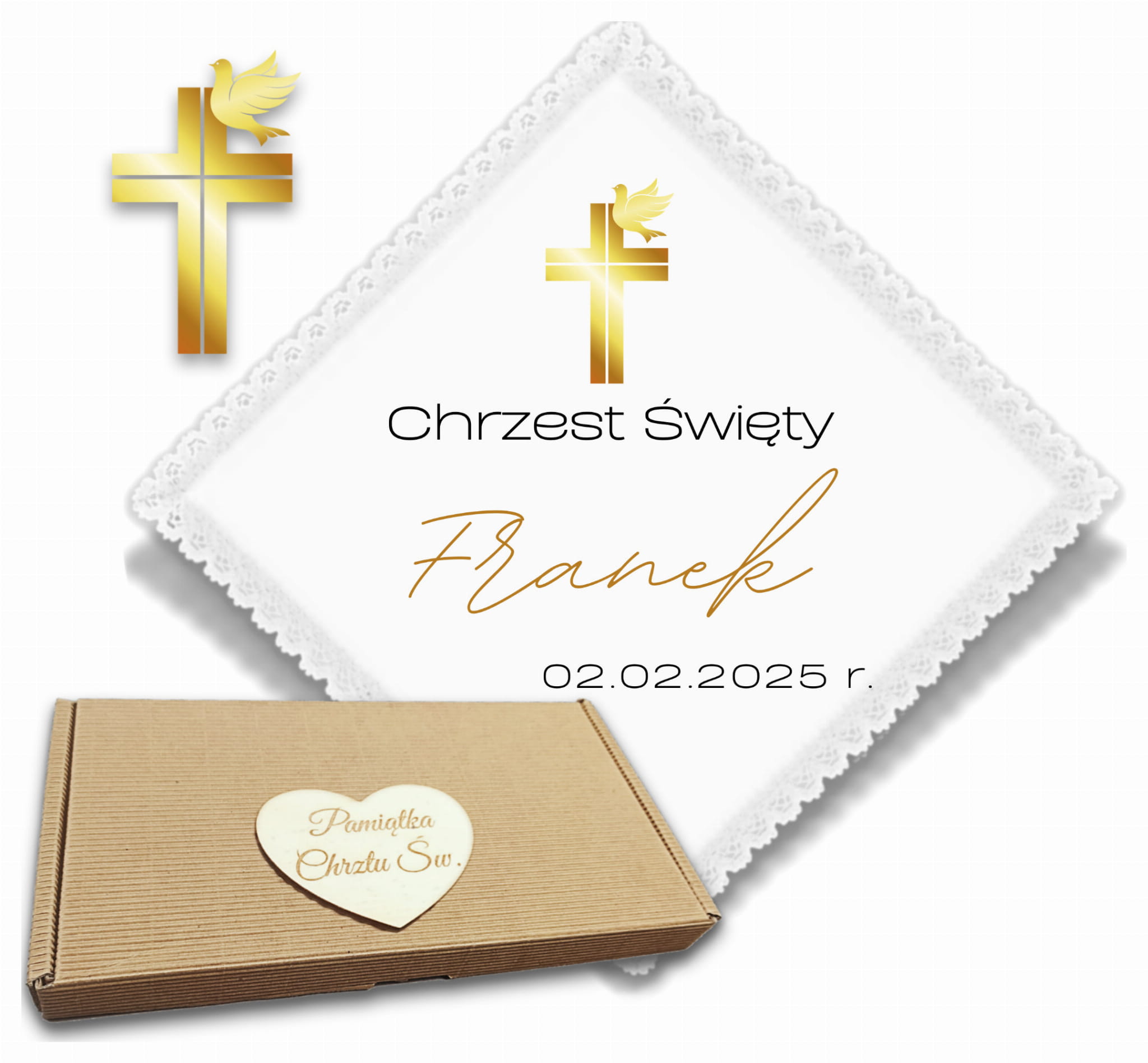 Szatka: Uszyta z delikatnych materiałów, ozdobiona subtelnym projektem, który można spersonalizować imieniem dziecka i datą chrztu. Idealna na symboliczne nałożenie w trakcie sakramentu.