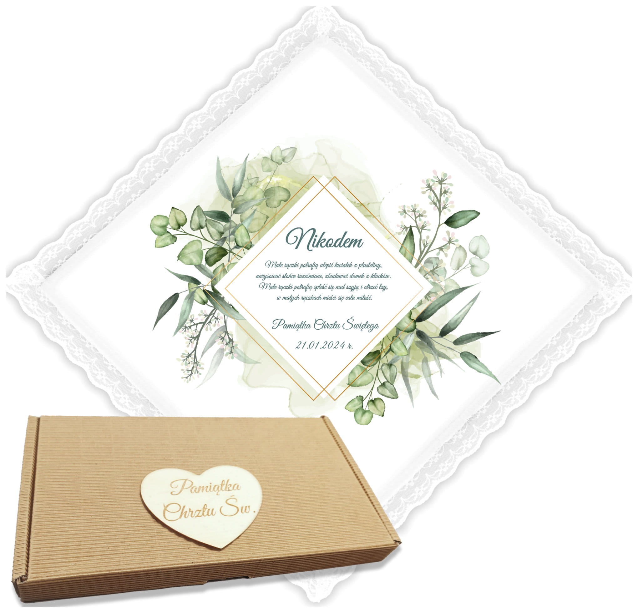 ✳️Eleganckie pudełko do przechowywania szatki ozdobione grawerowanym serduszkiem z napisem "Pamiątka Chrztu Św.".