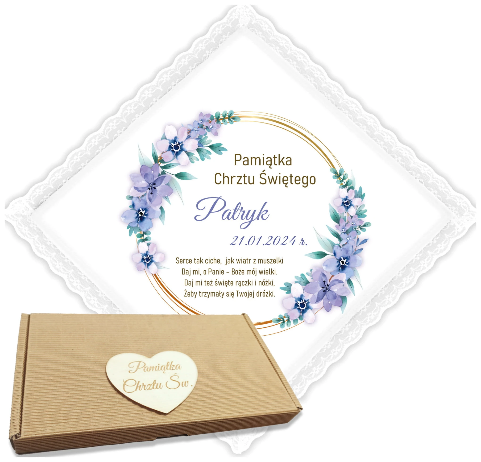 Spraw, by ta szatka była wyjątkowa! Oferujemy możliwość personalizacji imieniem Twojego dziecka oraz datą ceremonii.