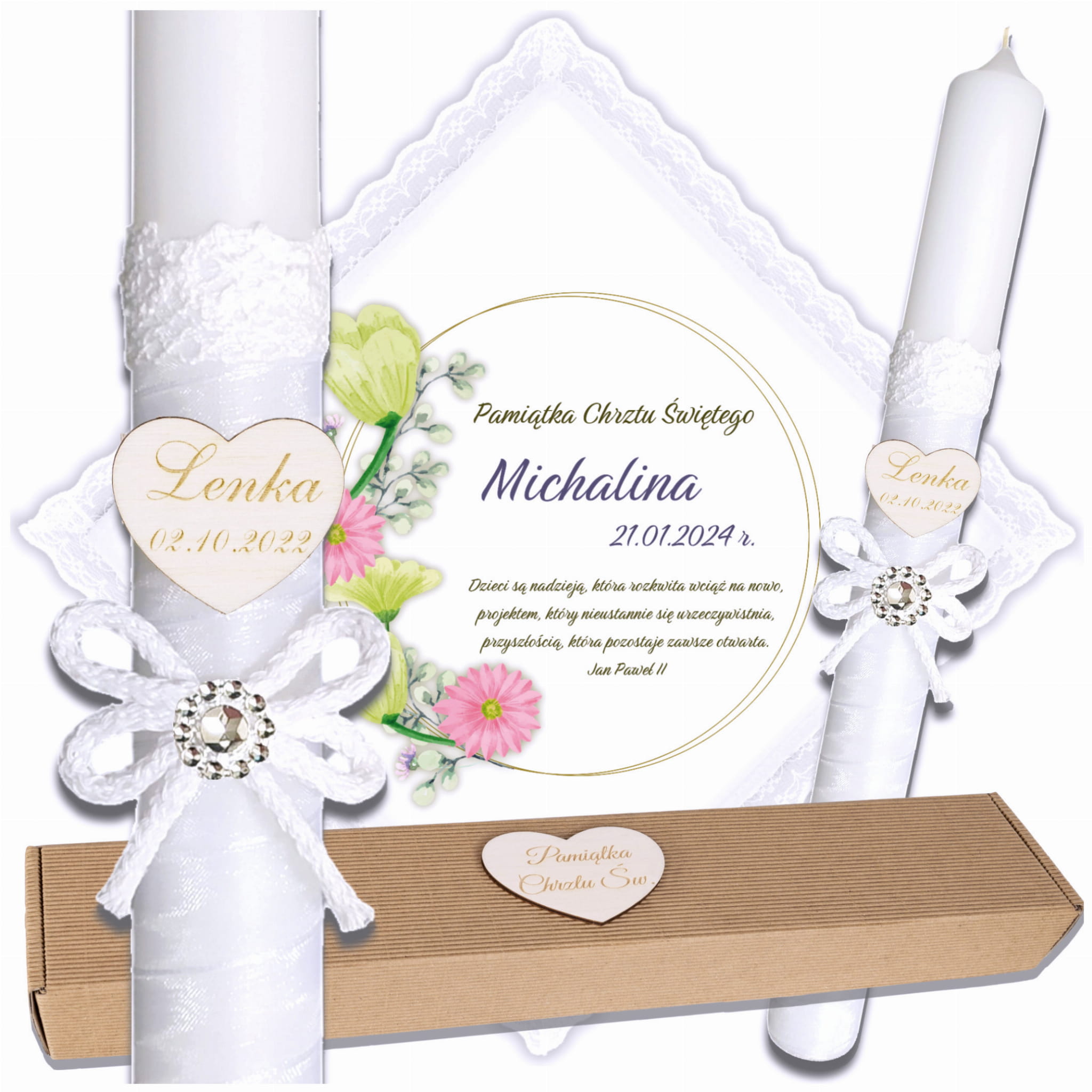 Spraw, by komplet był wyjątkowy! Oferujemy możliwość personalizacji imieniem Twojego dziecka oraz datą ceremonii.