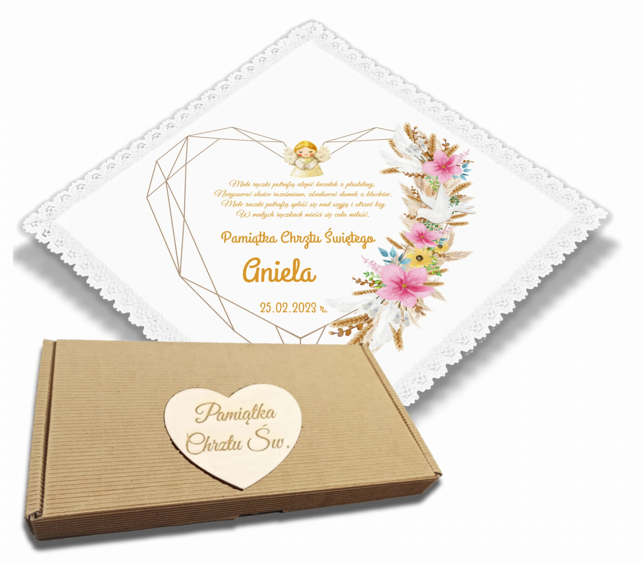 ✴️Eleganckie pudełko do przechowywania szatki ozdobione grawerowanym serduszkiem z napisem "Pamiątka Chrztu Św.".