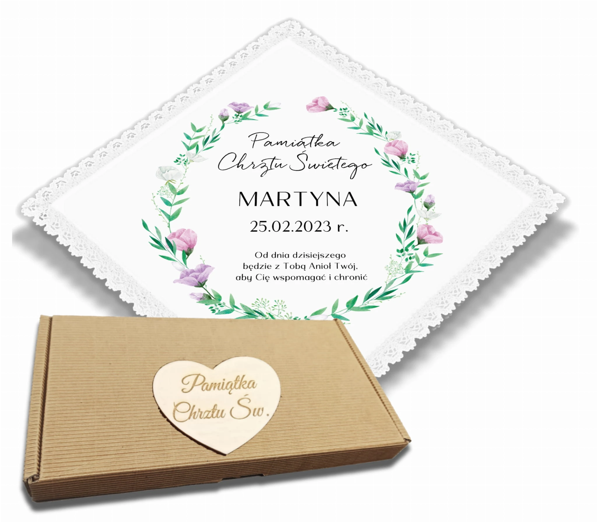 ✴️Eleganckie pudełko do przechowywania szatki ozdobione grawerowanym serduszkiem z napisem "Pamiątka Chrztu Św.".