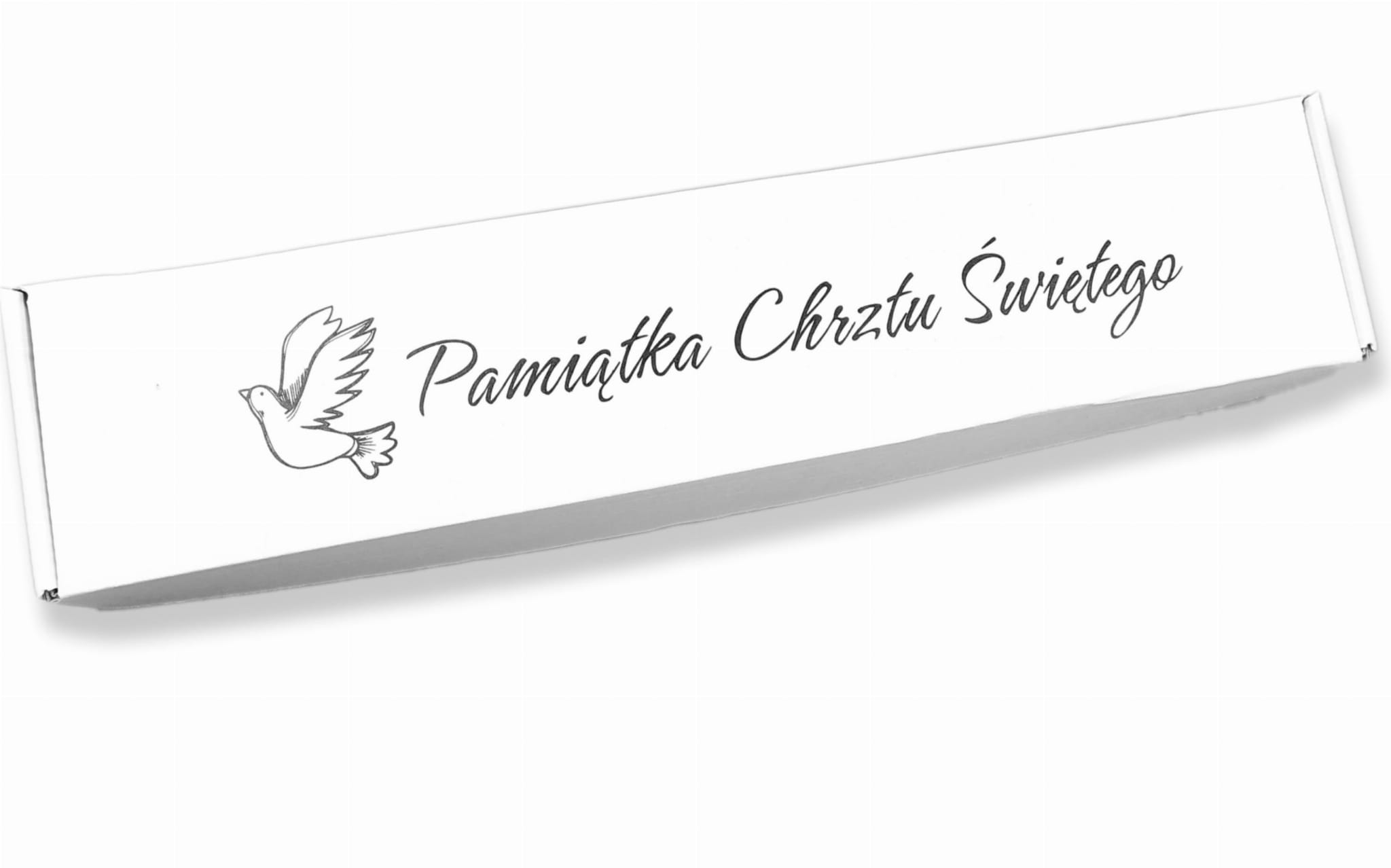 Pudełko dołączone do zestawu wykonane jest z białej tektury i ozdobione napisem "Pamiątka Chrztu Św.".