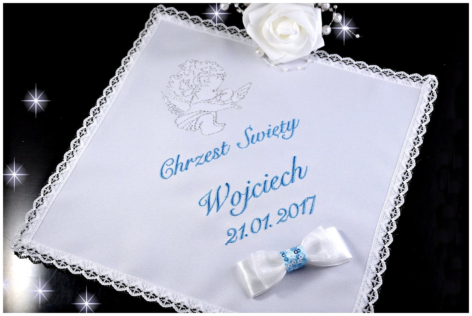 ✅ Personalizowany haft – imię dziecka, data Chrztu oraz ozdobne elementy