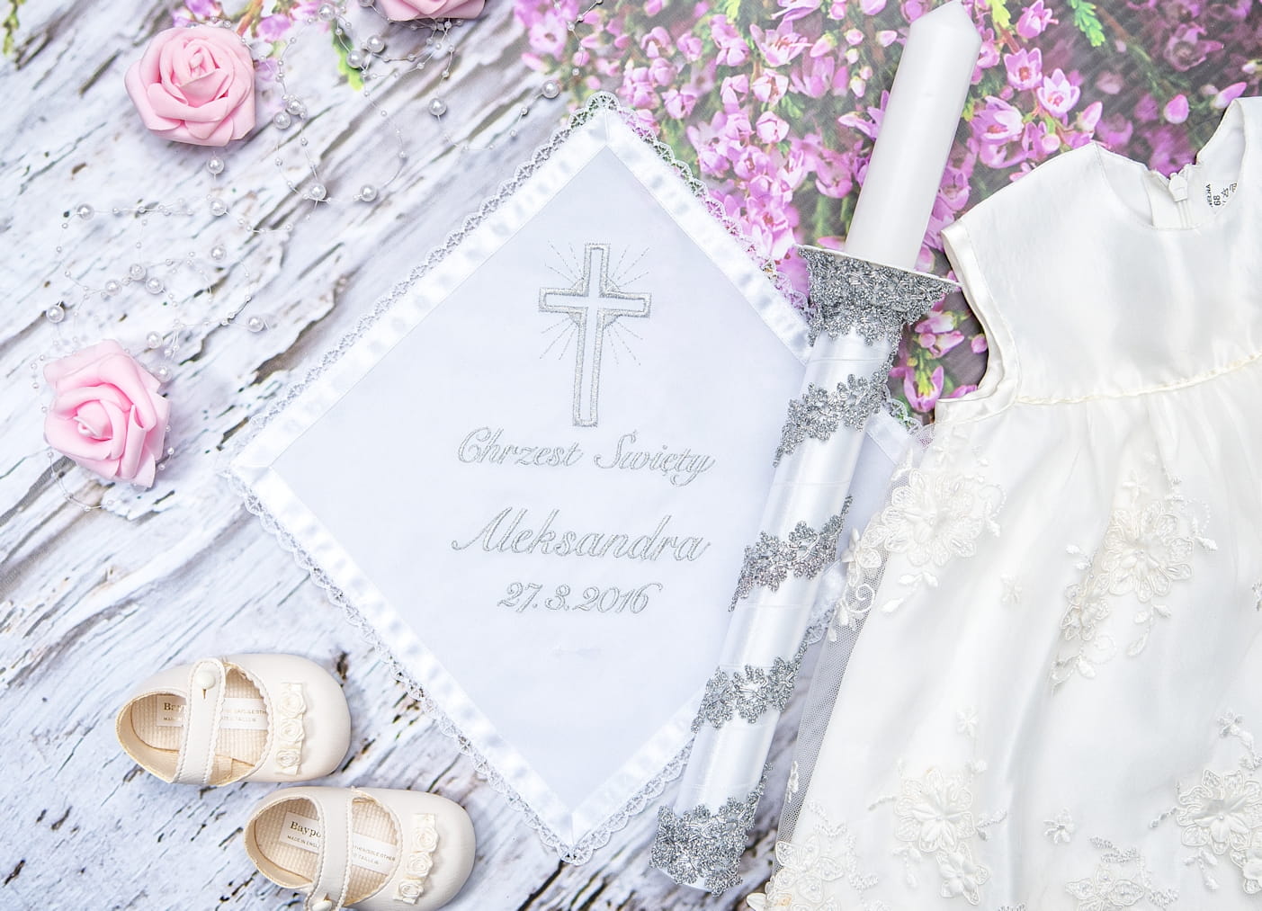 Kolekcja Selenit - Szatka na chrzest i świeca do chrztu z haftem imię i data MS6a