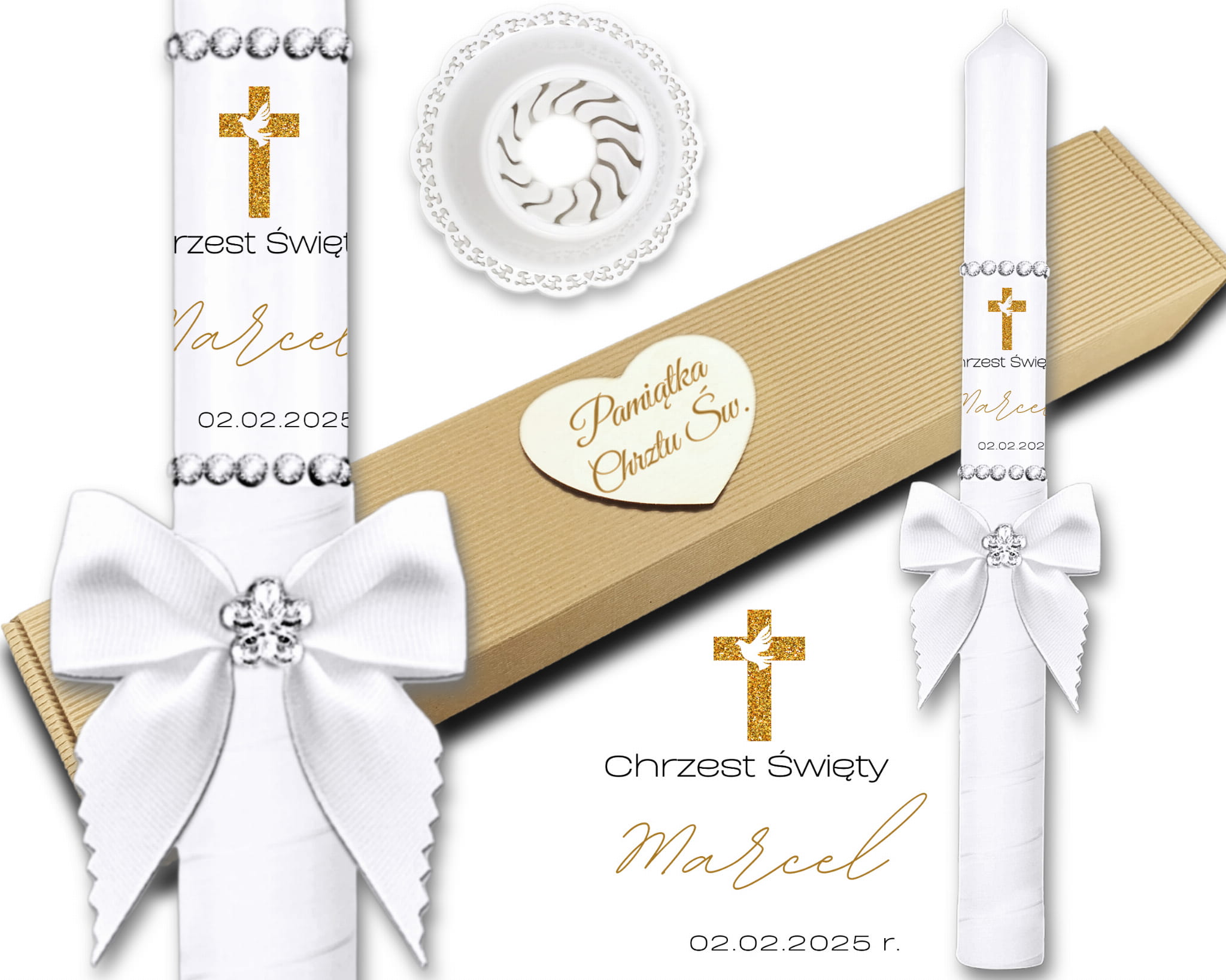✅ Świecę do chrztu ozdobioną kokardką i i cyrkoniami oraz indywidualnym projektem nadruku z imieniem dziecka i datą uroczystości.