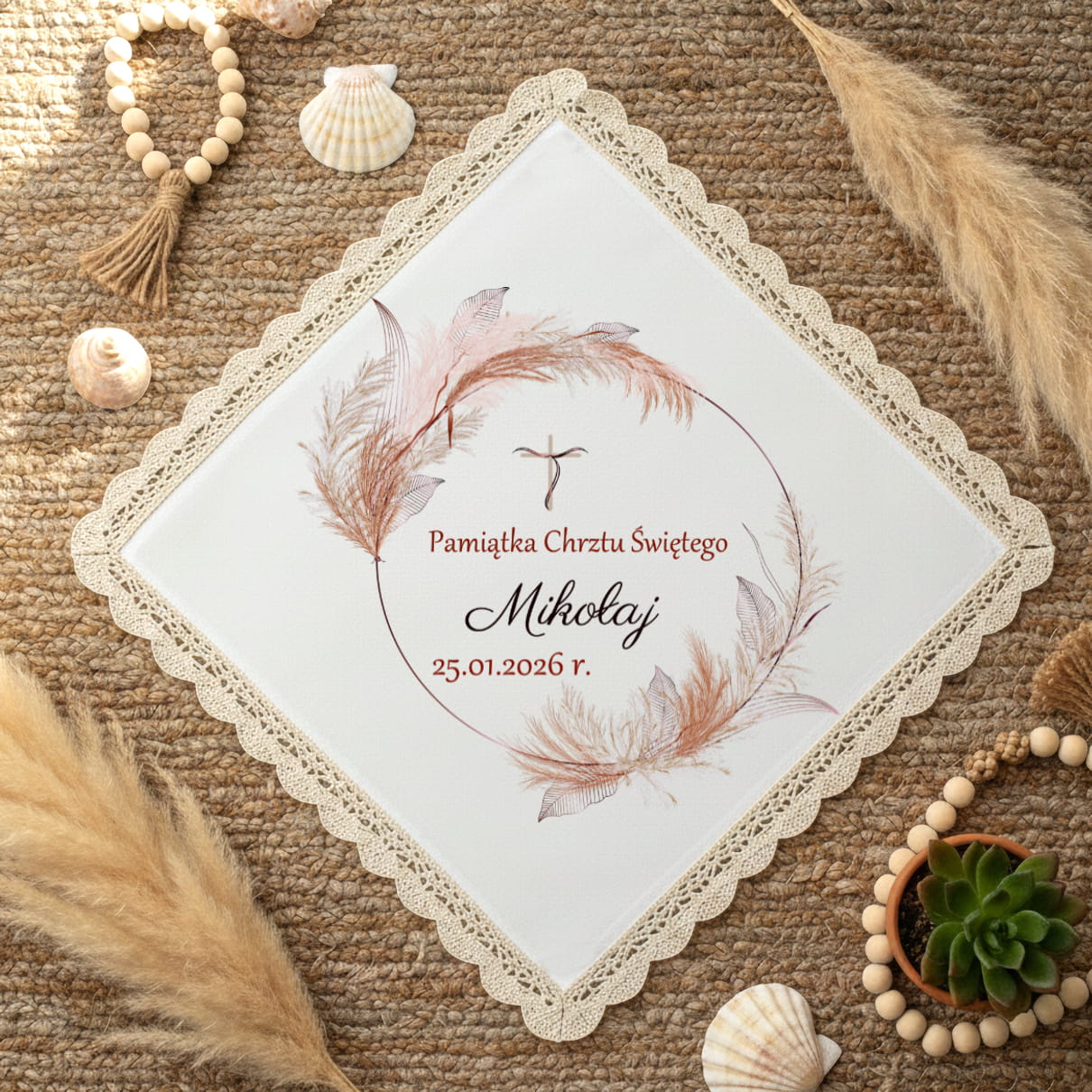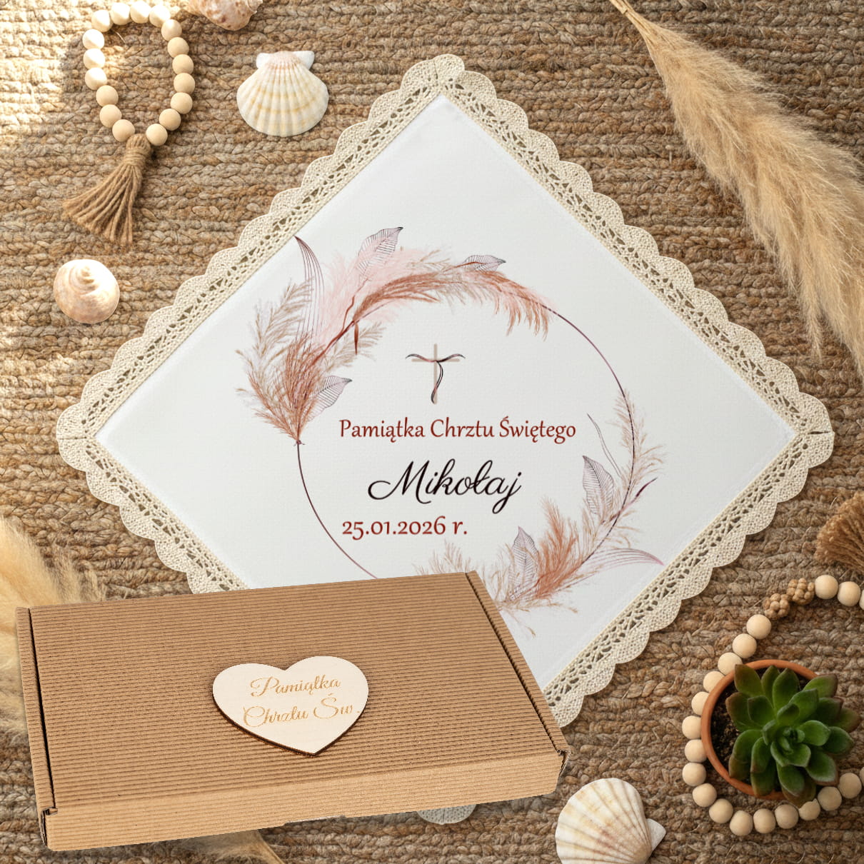 Szatka do Chrztu Świętego z Imieniem i datą Pudełko BOHO Pamiątka Chrztu N1