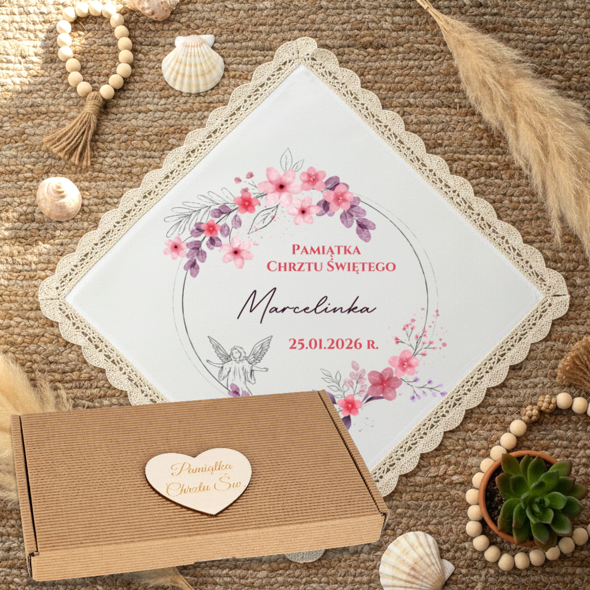 Szatka do Chrztu Świętego z Imieniem i datą Pudełko BOHO Pamiątka Chrztu N2