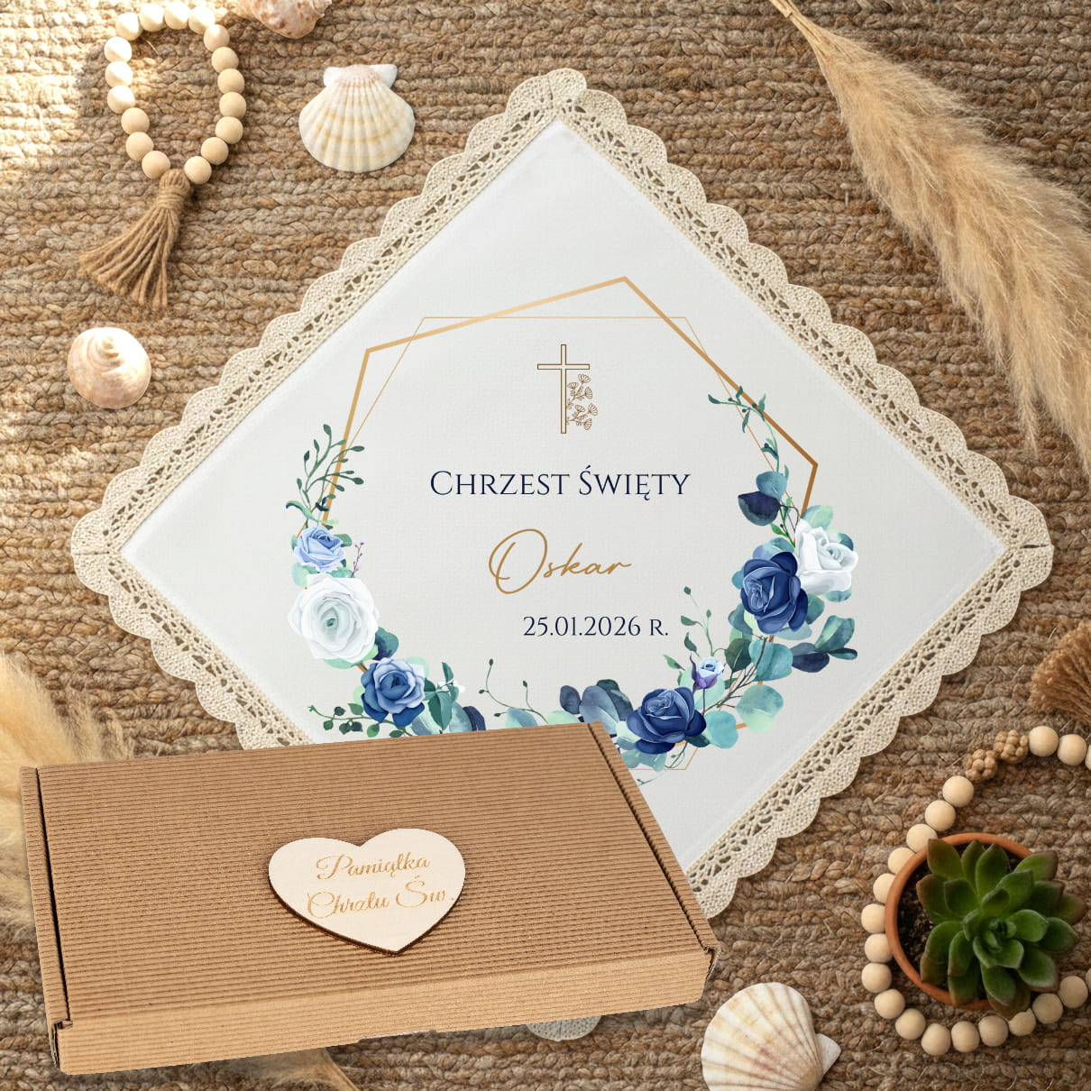 Szatka do Chrztu Świętego z Imieniem i datą Pudełko BOHO Pamiątka Chrztu N3