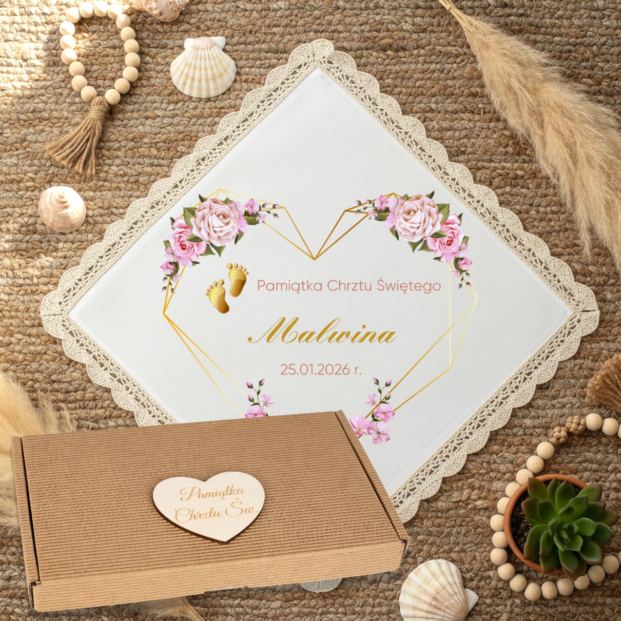 Szatka do Chrztu Świętego z Imieniem i datą Pudełko BOHO Pamiątka Chrztu N6
